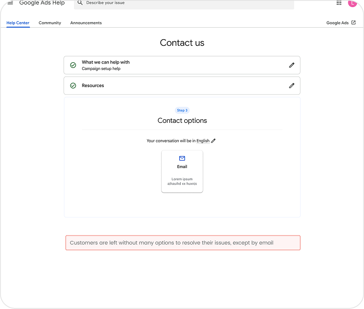 The interface was designed to guide advertisers through a clear, low-friction support experience. Early low-fidelity concepts were tested to validate flow, clarity, and expectations, with feedback integrated into the final design. The solution emphasizes clarity, progressive disclosure, and consistent patterns while remaining aligned with Google Ads design standards.
