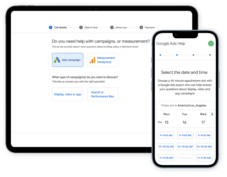 A paid consultation flow integrated directly into the Google Ads Help Center, allowing eligible advertisers to discover, purchase, and schedule one-on-one sessions with Ads Support Specialists.