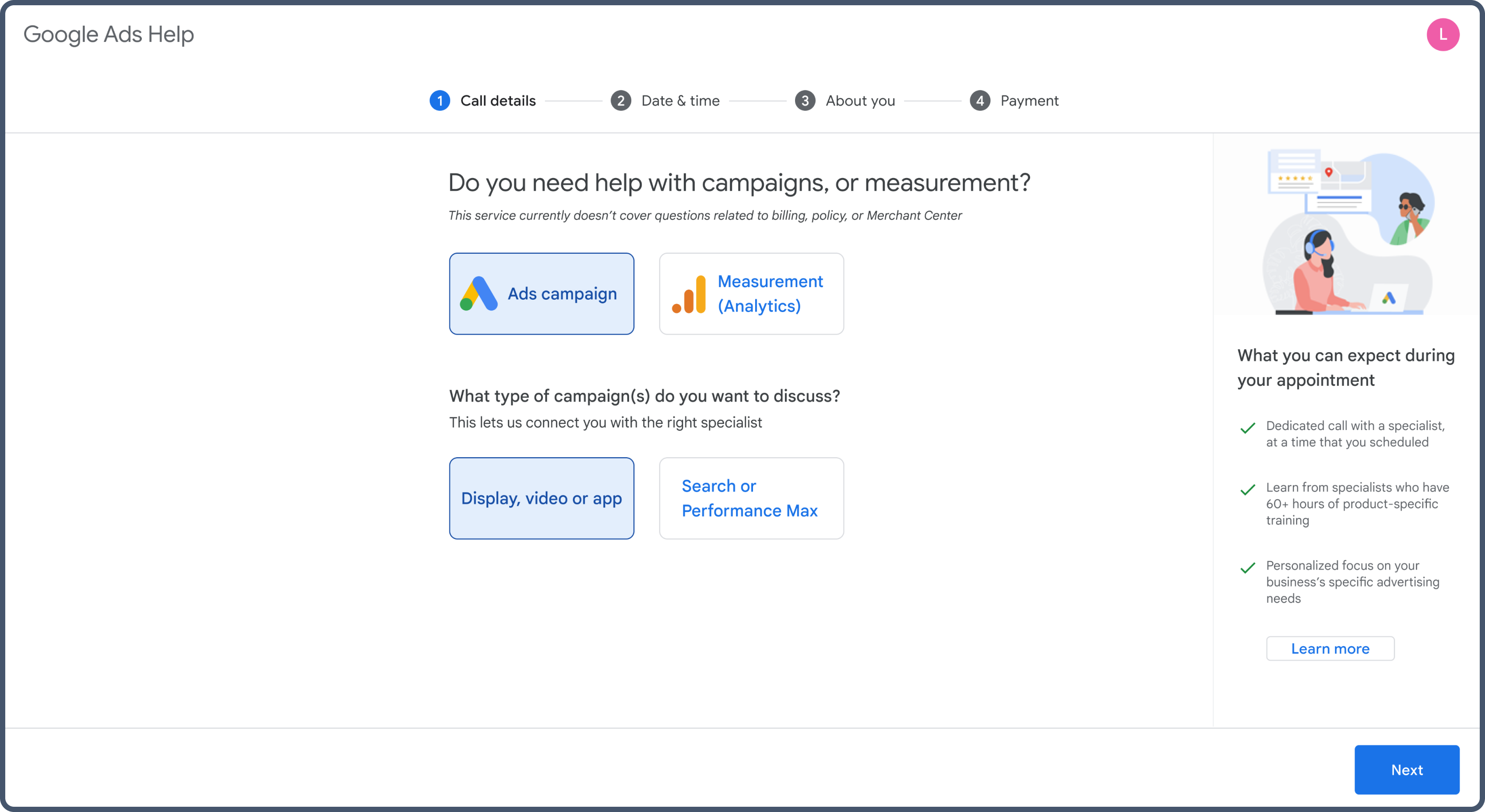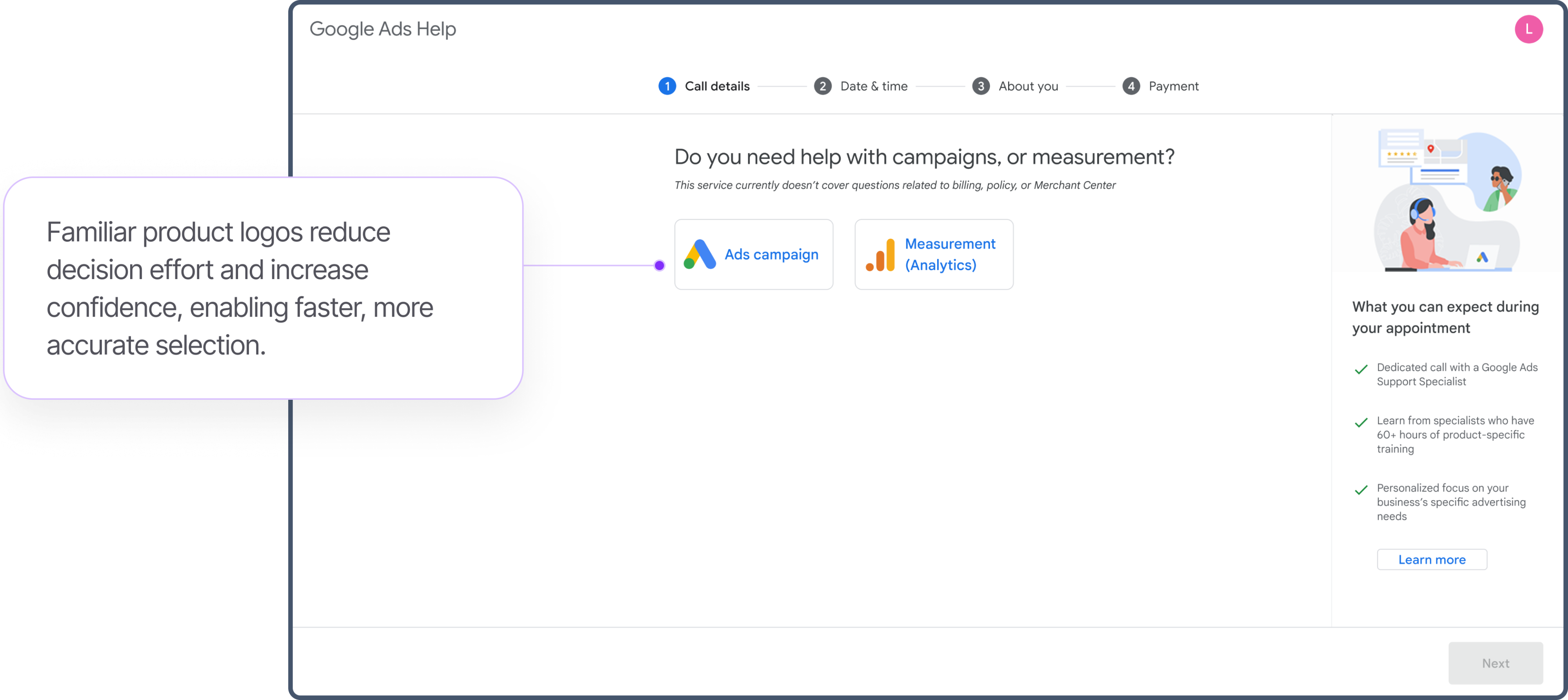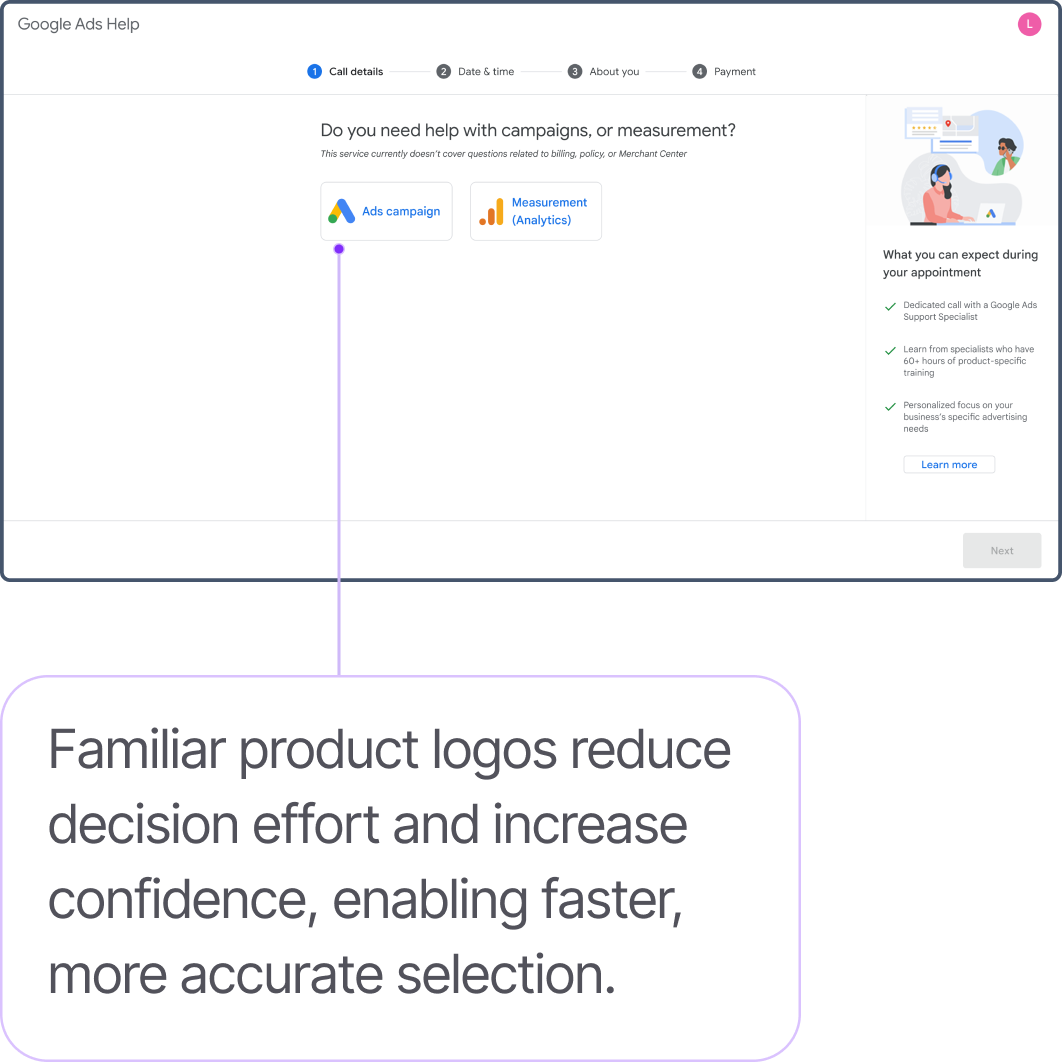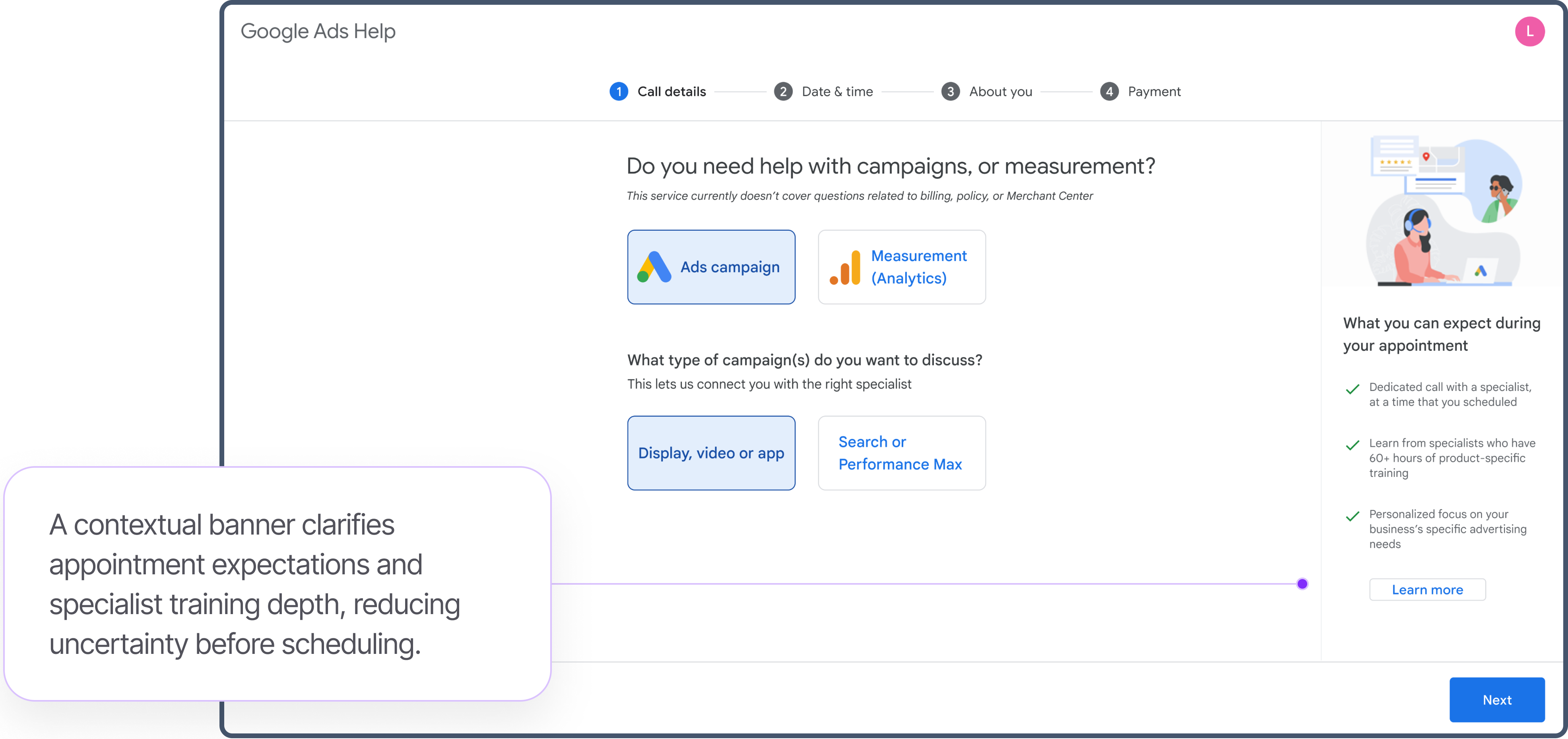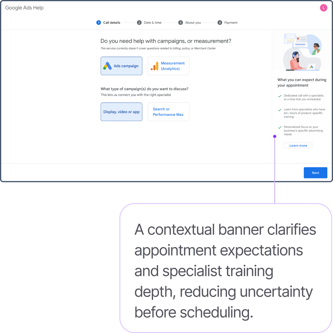 High-value advertisers often face complex campaign and measurement challenges that are difficult to resolve through self-service documentation or asynchronous email support. While these advertisers were eligible for enhanced assistance, there was no clear, reliable way to schedule personalized consultations with Ads Support Specialists.