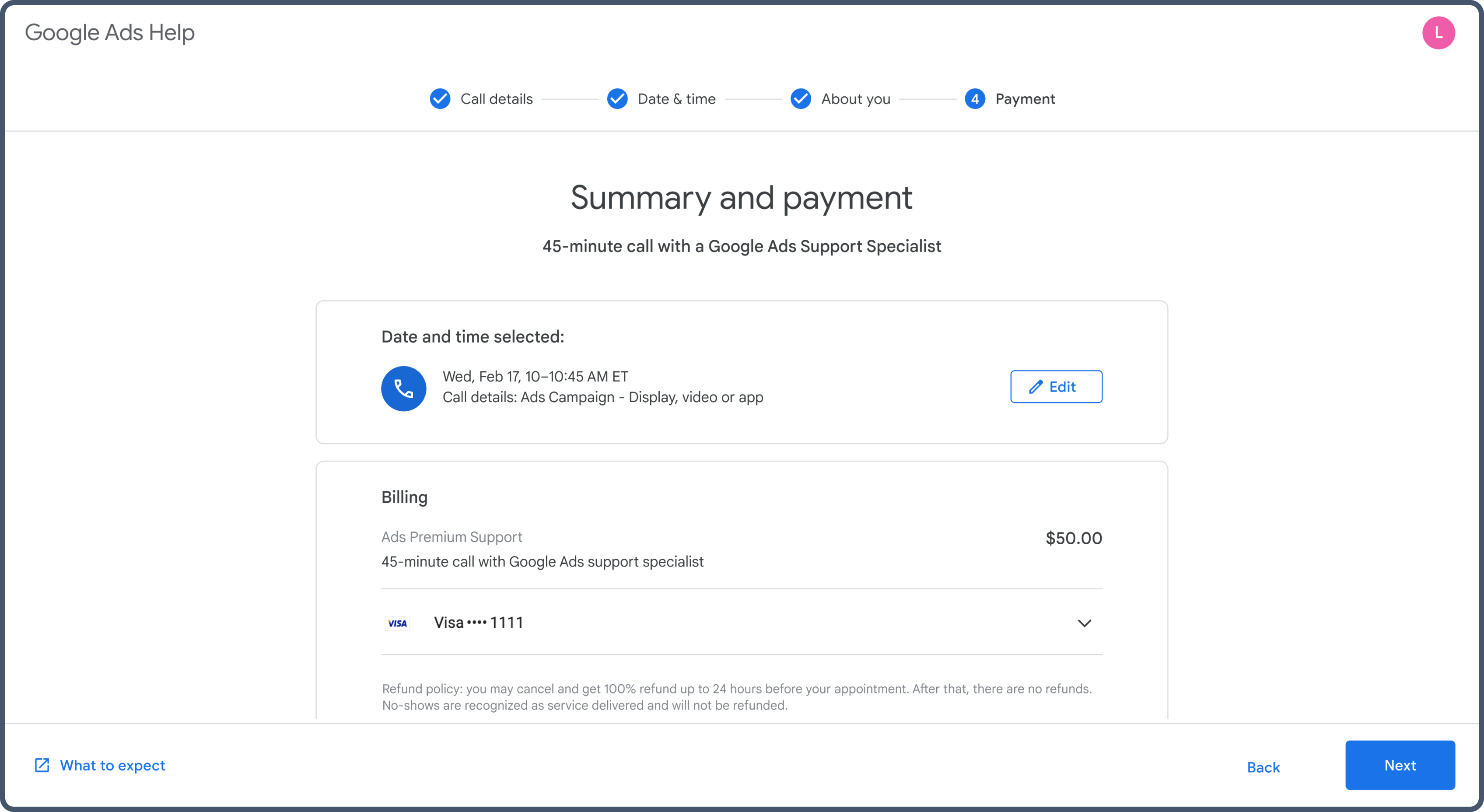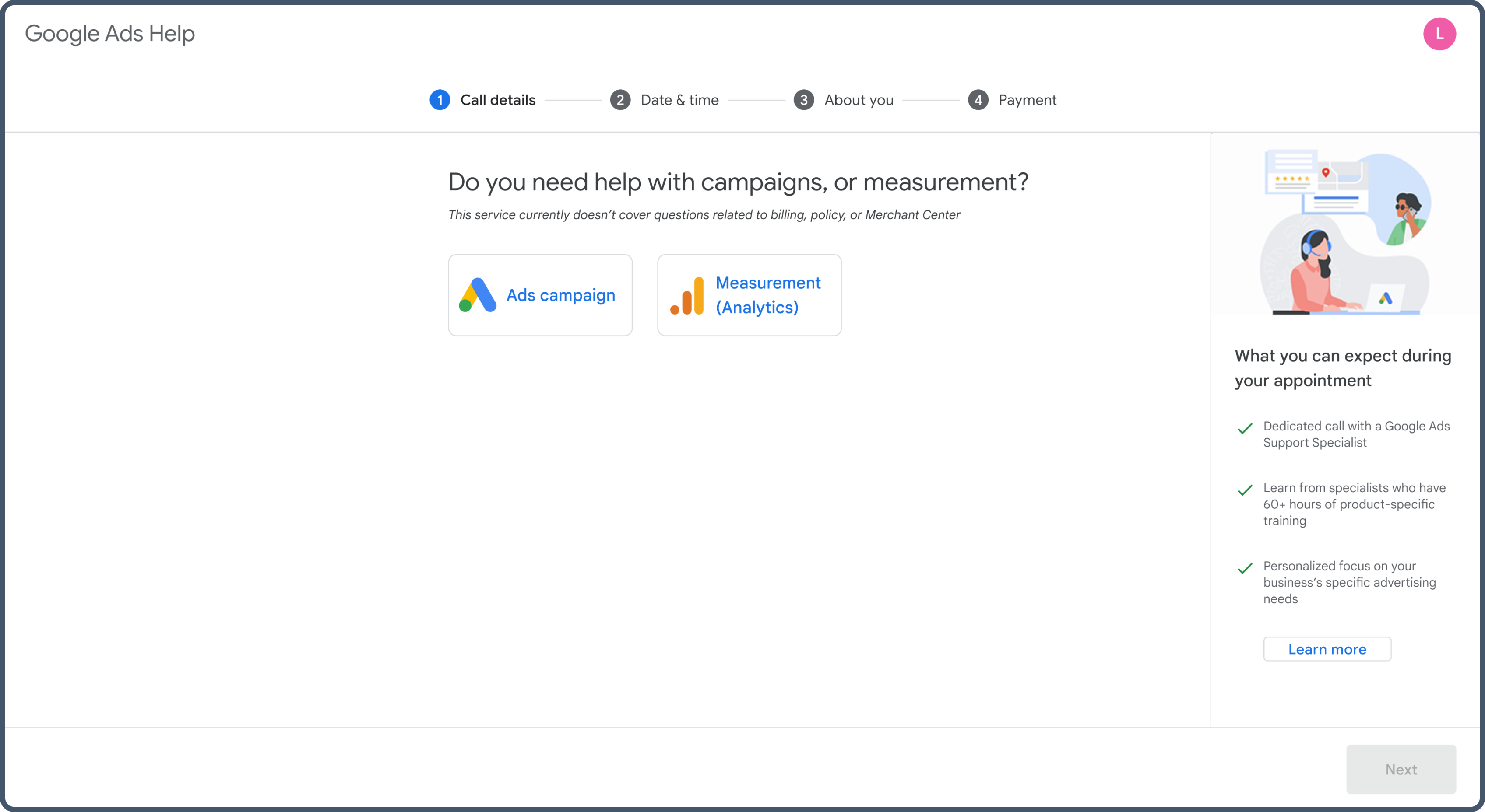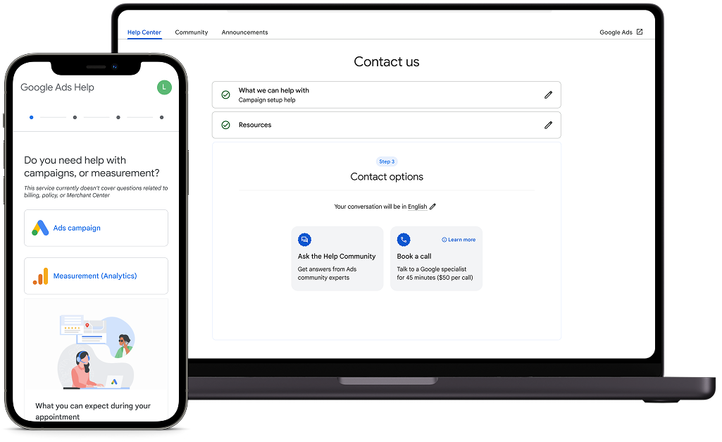 A paid consultation flow integrated directly into the Google Ads Help Center, allowing eligible advertisers to discover, purchase, and schedule one-on-one sessions with Ads Support Specialists.
