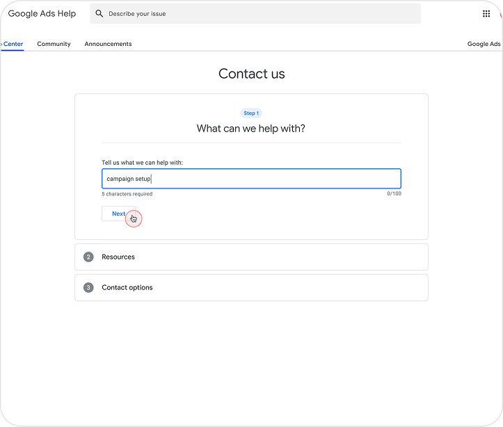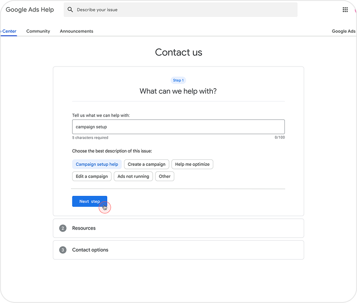 The interface was designed to guide advertisers through a clear, low-friction support experience. Early low-fidelity concepts were tested to validate flow, clarity, and expectations, with feedback integrated into the final design. The solution emphasizes clarity, progressive disclosure, and consistent patterns while remaining aligned with Google Ads design standards.